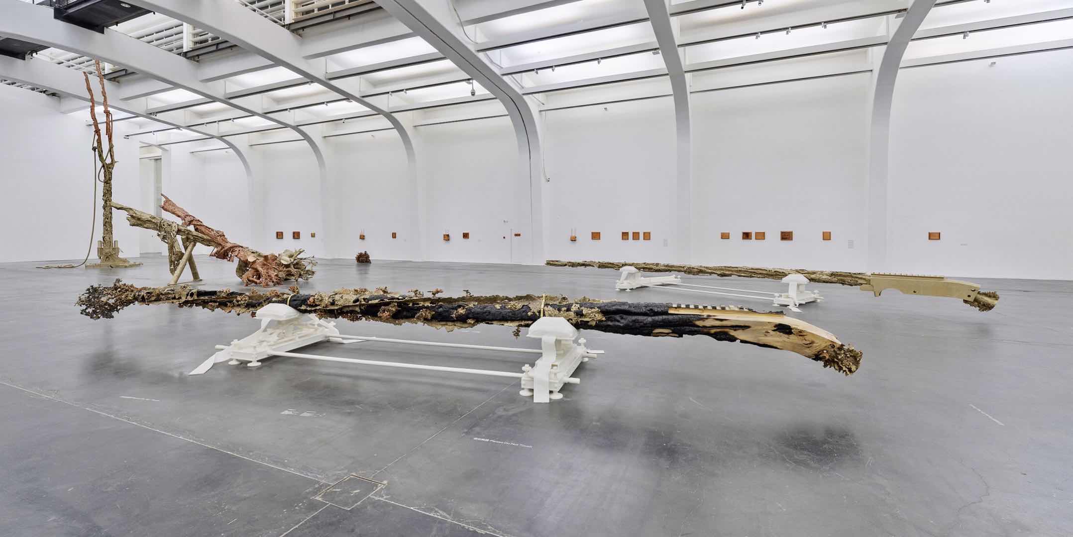 此次展览的新作延续了艺术家过去十年间在创作媒介上的显著转变——从早期作品中使用的塑料与凡士林,到《重生之河》中别具一格的铸造金属。巴尼将传统铸造工艺与全新电子科技,以及一系列前所未有的科技相结合,创作出兼具形式与媒介复杂性和叙事密度的艺术作品。例如,展览中的5件巨型雕塑便由从锯齿山脉被烧毁森林里获得的树木演化而来。艺术家将熔化的红铜与黄铜浇灌于树木内,任其在树干中流淌,创造出展现树木内部核心的独特金属铸品,而这每一件将树木残存部分融入其内的雕塑均成为了记录爱达荷州面貌的真实痕迹。在本次展出的5件雕塑作品中,亦包含一件艺术家为UCCA建筑空间特别定制,此前从未展出过的雕塑作品。
